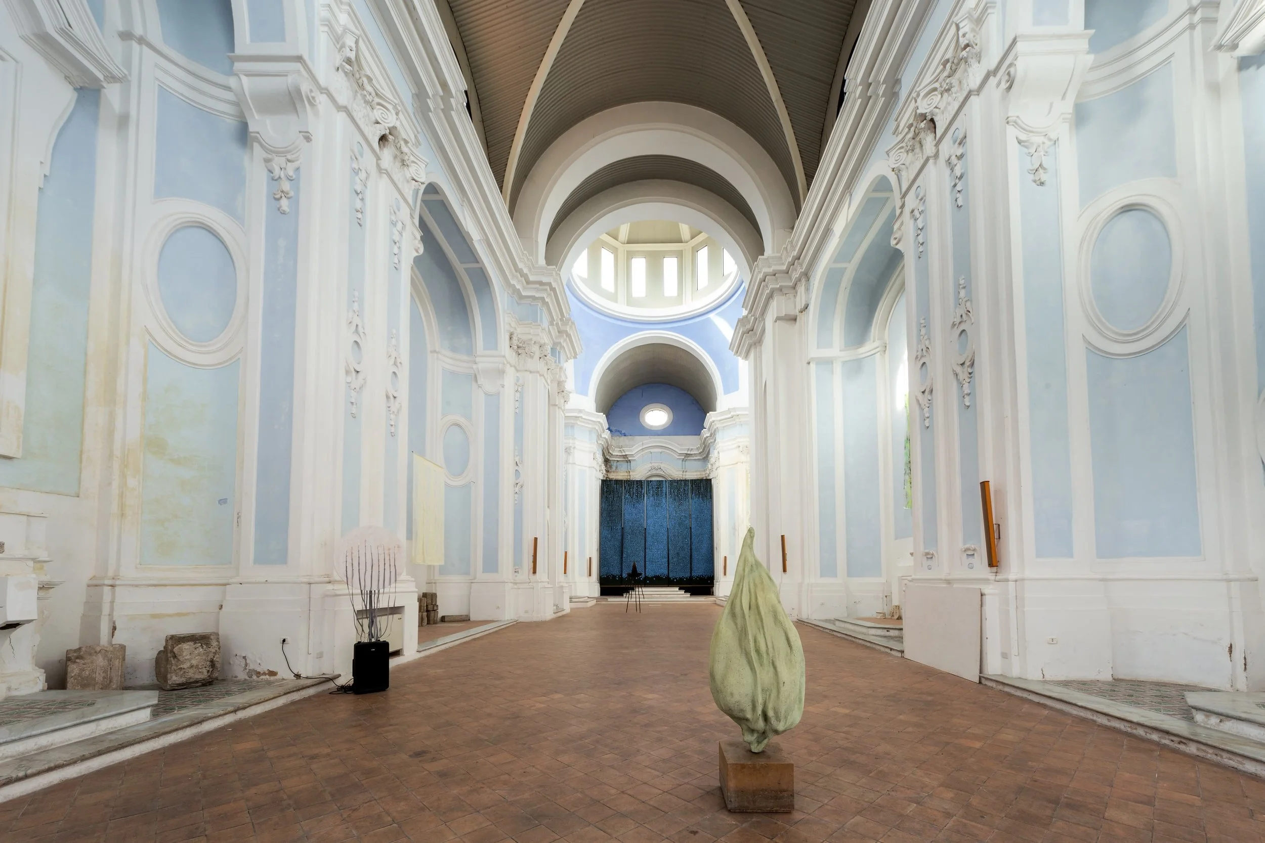 L’opera di Vincenzo Rusciano (Napoli 1973) è un tessuto che vive di contraddizioni e ipotizza un ideale spostamento di quella classicità, che ancor oggi continua ad essere un importante giacimento della nostra eredità culturale, dentro l’estetica della contemporaneità. Il basamento dell’altare della chiesa ospita Isola, di Luigi Mainolfi (Rotondi 1948), esponente di spicco della cosiddetta scultura post-concettuale, impostasi al principio degli anni Ottanta. L’opera di Mainolfi innalza sul sole e oltre il sole (riconoscibile negli elementi del piedistallo che appaiono come raggi) un elemento naturale spoglio e umile come il legno, operando un rovesciamento alchemico nel quale il valore minimo di un materiale povero assurge potentemente a valore assoluto. Chiude il cerchio, e lo rimette in gioco, Matteo Montani (Roma, 1972), facendo incontrare cielo e terra sulla superficie scura della carta abrasiva.